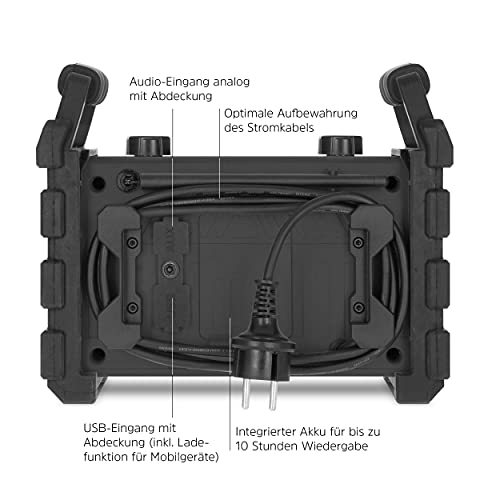 Kompakt und robust: Das robuste Gehäuse des Digital-Radios schützt die Elektronik des Gerätes vor Schlägen oder Stößen, das Baustellen-Radio ist nach IP65 staub- und wassergeschützt