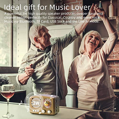 ♥Perfektes Musikerlebnis: 1) Unser küchenradio retro unterstützt Flash-USB und TF-Karte (0-32GB). Bedeutet, dass es eine zusätzliche MP3-Funktion hat. 2) Mit AUX- und Bluetooth-Funktion (10m). Das Bluetooth radio vintage kann sogar als Lautsprecher Ihres Telefons oder Computers funktionieren. 3) Ausgestattet mit einem eingebauten 3W-Magnetlautsprecher, der einen zuverlässigen tiefen Bass und sanfte Höhen liefert. (★Hinweis: keine Kopfhörerbuchse & keine Unterstützung für Bluetooth-Kopfhörer)