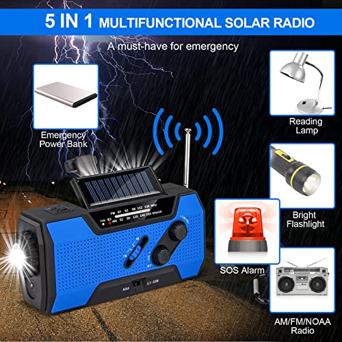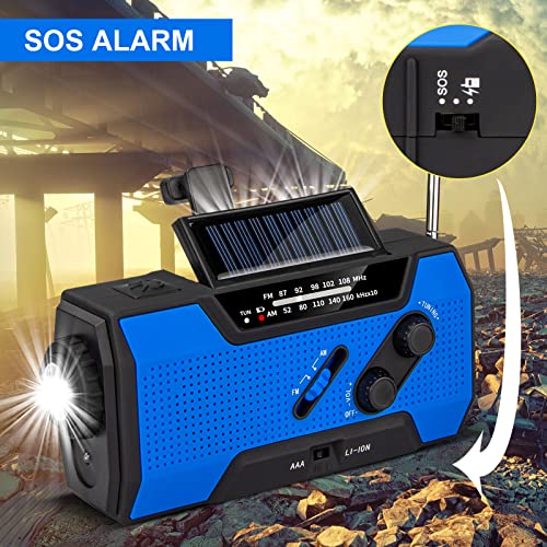 [SOS-Alarm mit Blinklicht] Das Solarradio ist mit einer SOS-Funktion ausgestattet. Wenn Sie sich einem Dilemma, einer Gefahr oder einem dunklen Ort gegenübersehen, doppelklicken Sie auf die SOS-Taste, um die laute Sirene und das blinkende Fernlicht zu aktivieren, um andere daran zu erinnern