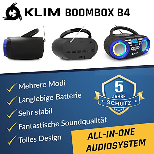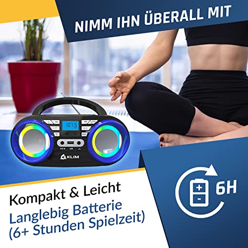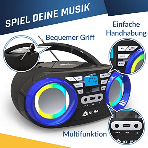 KLIM B3 Tragbarer CD Player – NEU 2023 – FM Radio, CD, MP3, Bluetooth, AUX, USB, RGB LED – CD Boombox – Kabel…