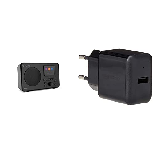 Pure Elan One tragbares DAB+ Radio mit Bluetooth 5.0 (DAB/DAB+ und UKW Radio, 2,4″ TFT Display, 20 Senderspeicher, 3-Preset-Tasten), Schwarz & Amazon Basics – USB-Ladeadapter mit 1 Anschluss – Schwarz