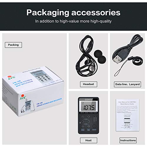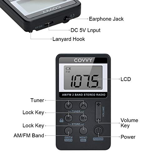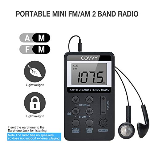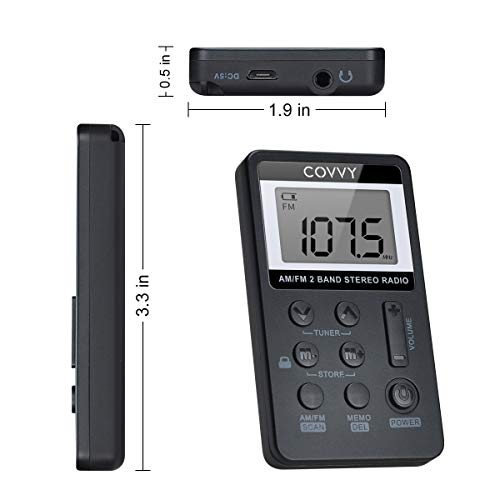 Specification: AM/FM Tragbares Radio,Covvy Digitales Pocket Mini Radio mit 500mAh 3.7V Wiederaufladbarer Akku und Kopfhörer (Black)